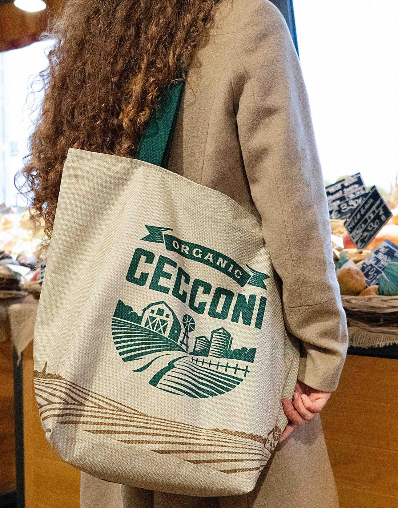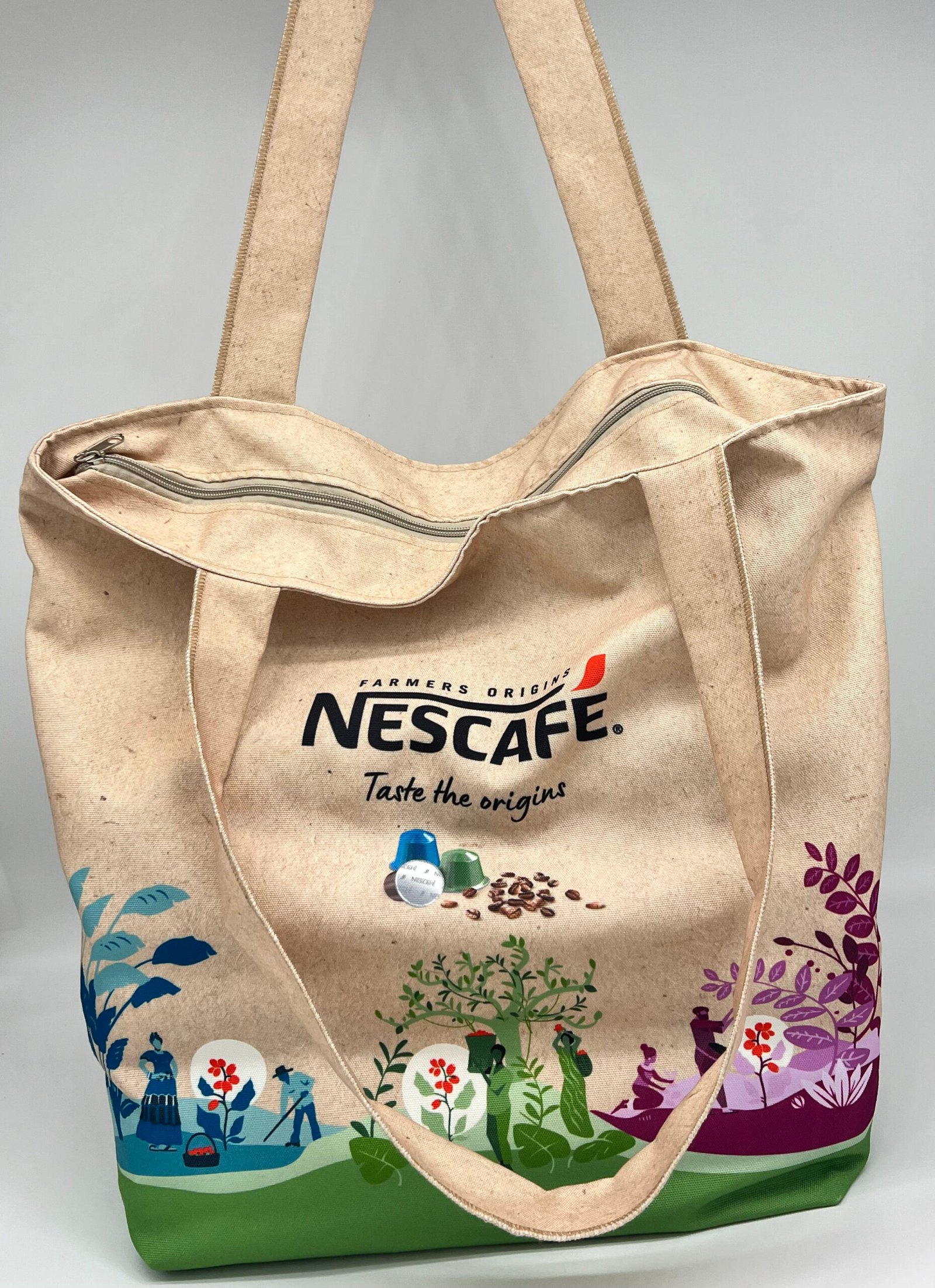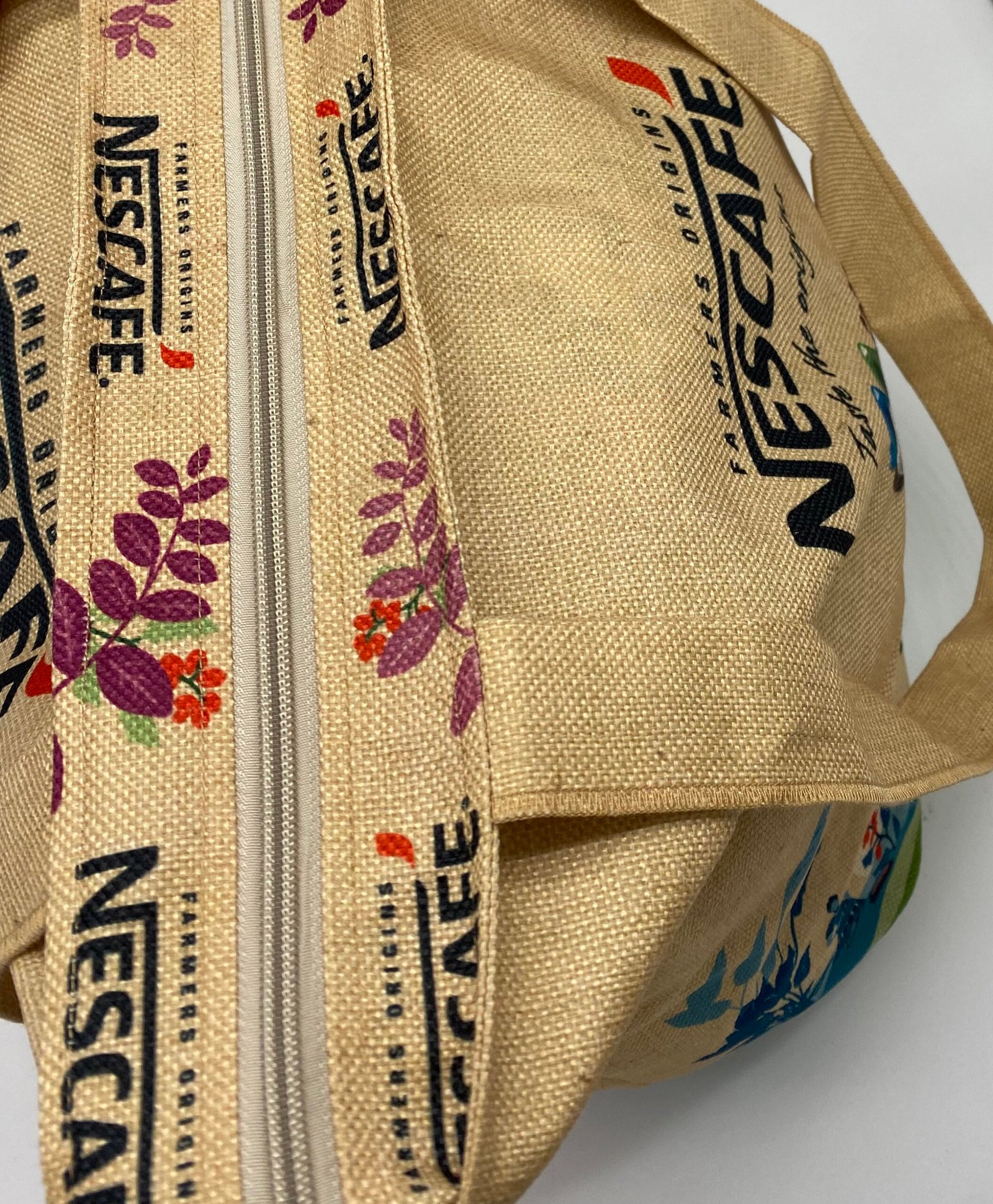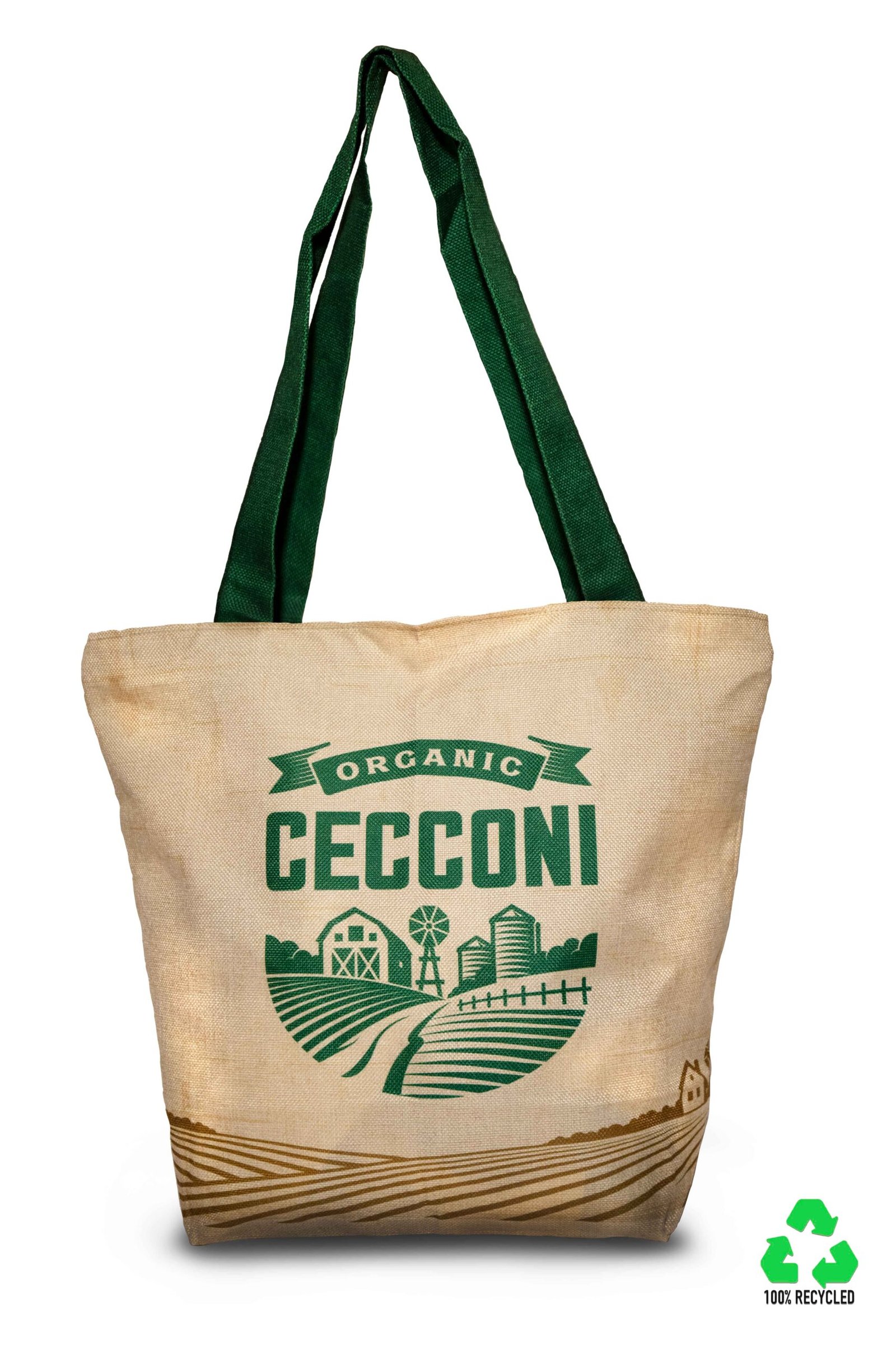 R-PET fabric Jute look-like. Fully printed on all surface. Standard size 42×48 x 16 cm with zip