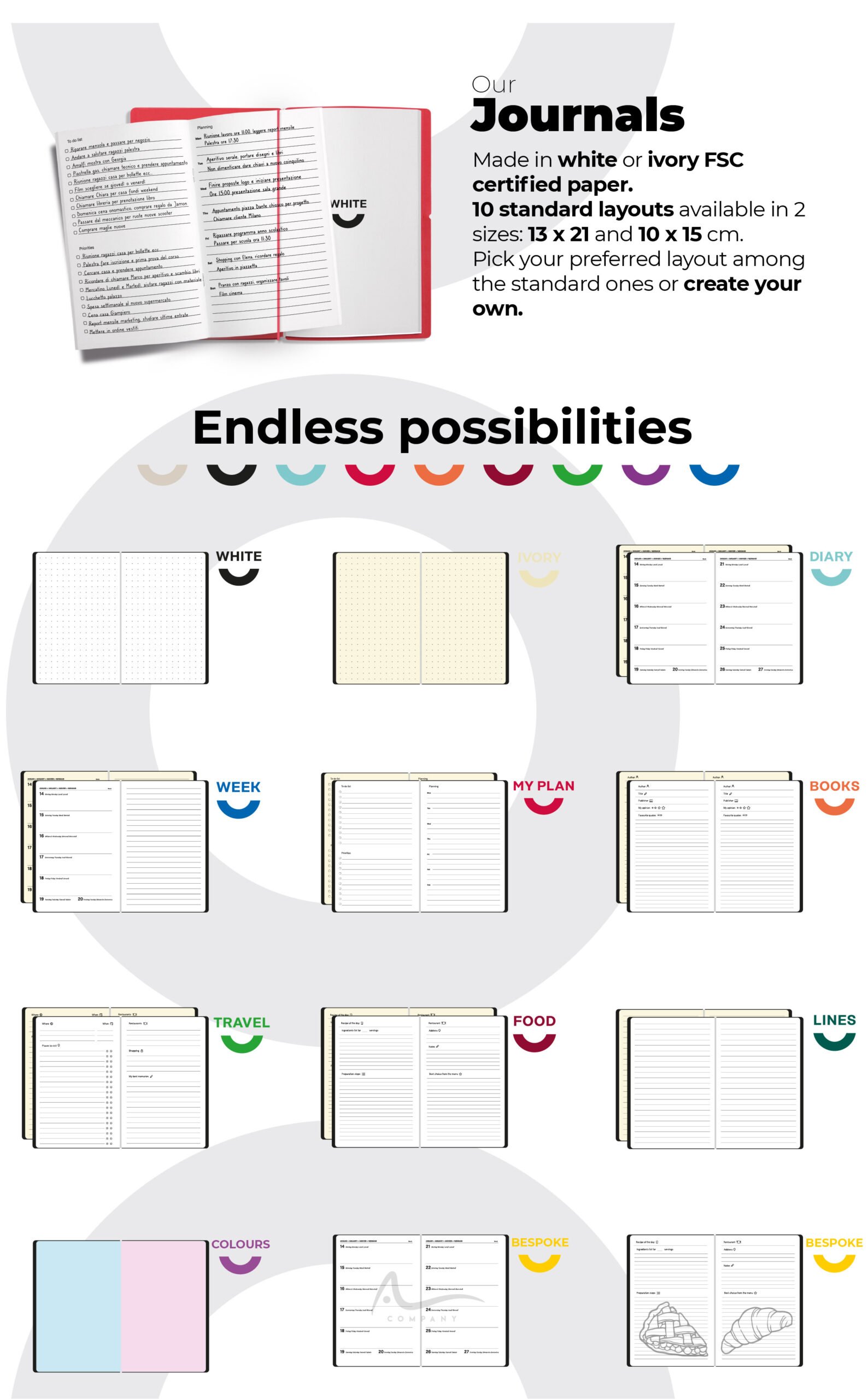 • Options: Elastic band available in many colours to coordinate with your brand identity, plus the possibility to develop custom printed inner layouts tailored to your company or campaign.