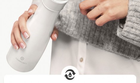 Liz is a digital, self-cleaning thermal bottle produced by the French brand Noerden. Its main strength is its technology: it has a built-in sterilisation system that uses UV rays to eliminate 99% of viruses and odour-causing bacteria. The lid is equipped with a capacitive touch-sensitive sensor and LED light that indicates the liquid temperature via an infrared sensor. Tap once to check the temperature, tap twice to start sterilisation. If the bottle is not touched for 2 hours, the bright LED on the lid flashes to remind you to drink. Thanks to the double-layered wall Liz keeps drinks hot or cold from 12 to 24 hours. Liz is designed to contain any kind of liquid: it is compatible with all colourings, whether natural or artificial, and no chemical can damage its interior, which is made of 316L surgical stainless steel. It has a 500 mAh lithium battery that lasts about a month with one UV sterilisation per day, and can be recharged via a USB cable. It has a capacity of 480 ml and its interior is made of stainless steel. It is available in white, black and red and can be customised with logos by laser engraving.